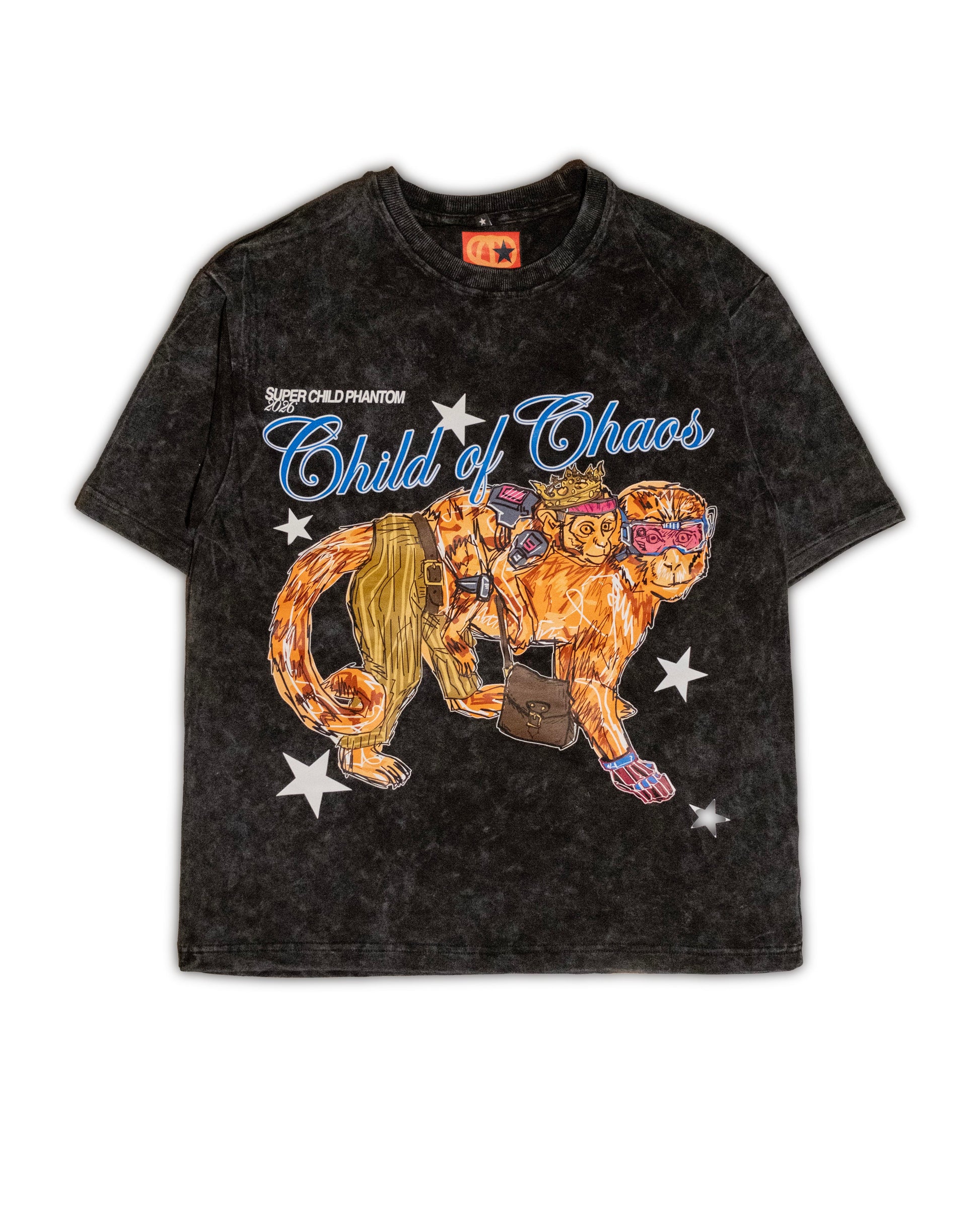 Front and center: two monkeys — a father holding steady below and a mischievous son riding on top — a playful reminder that chaos runs in the family. Above them, the bold words “Child of Chaos” complete the story: loud, free, and unapologetically alive.