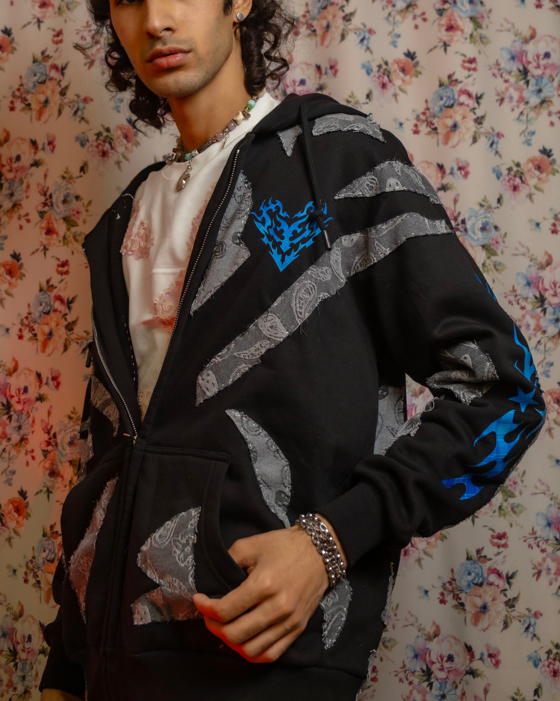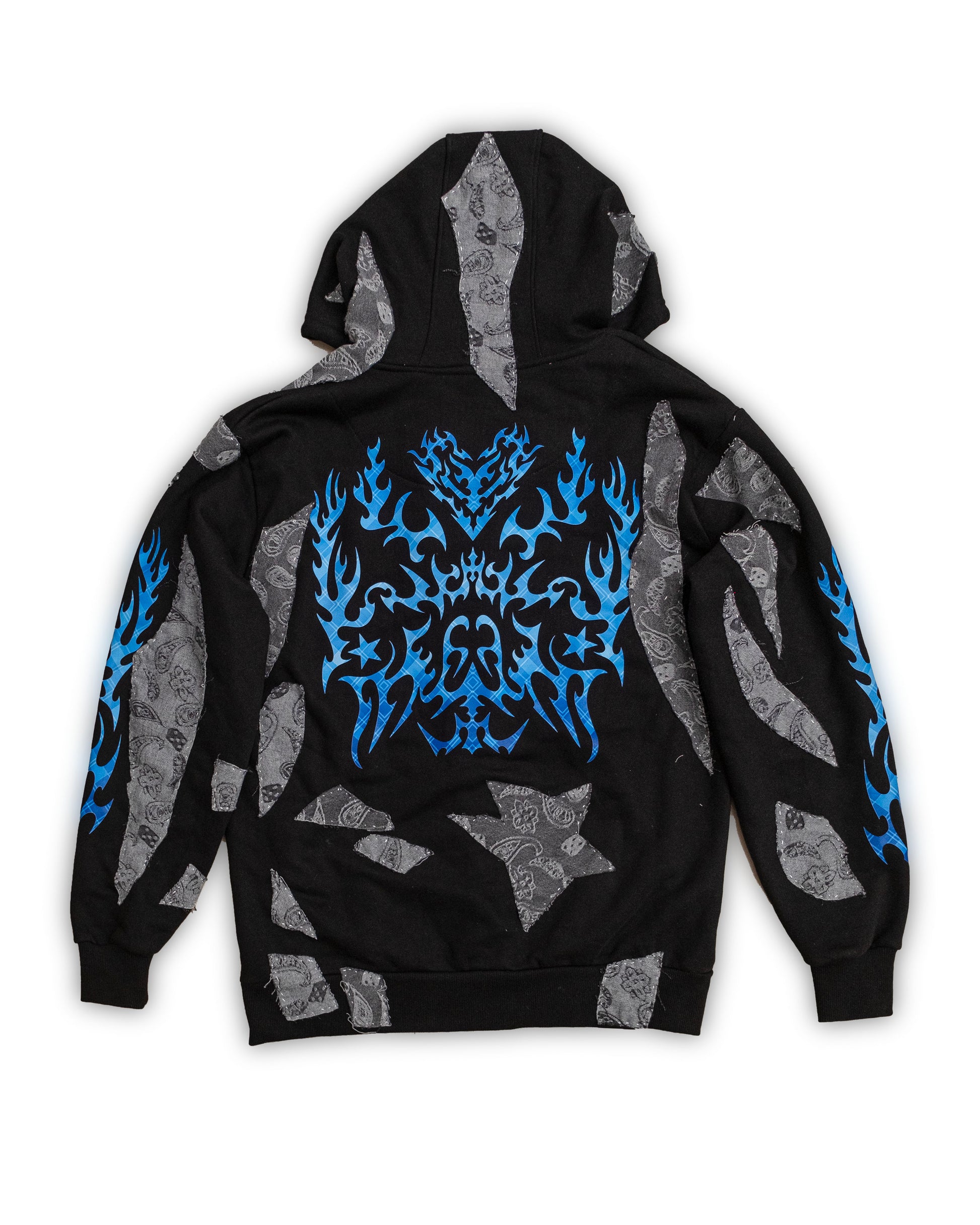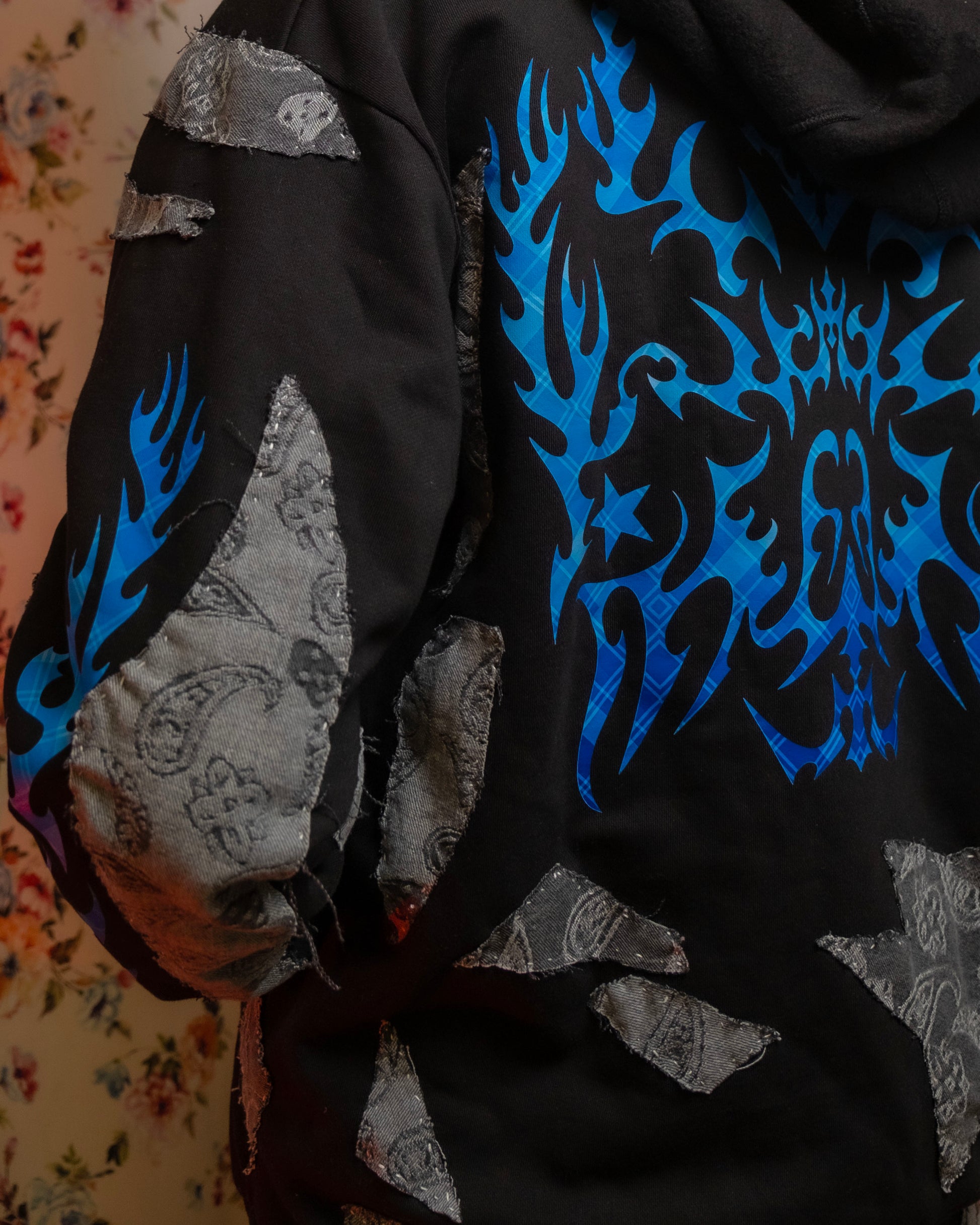 Beautiful 1 of a kind black zip hoodie with beautiful grey denim patchwork giving a nostalgic goth vibe and emphasizing the blue flames print! Only one of these hoodies will ever be made in this lifetime. It is a piece only for you. Comes in Size Large only.