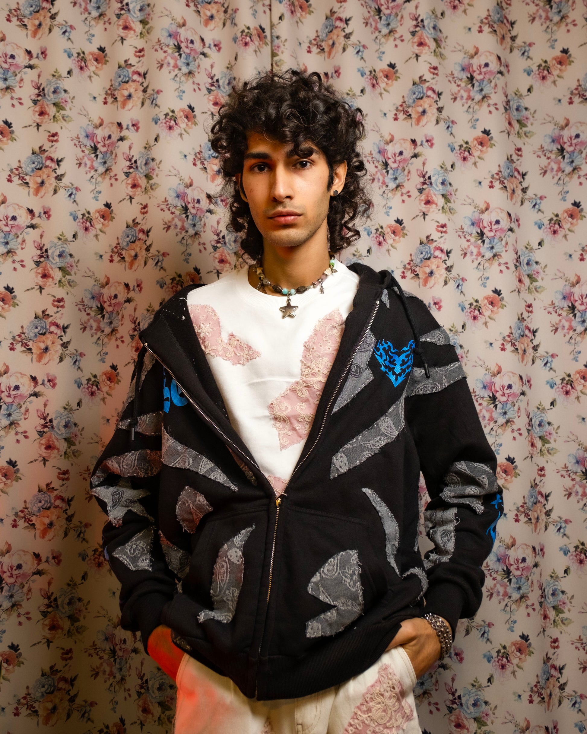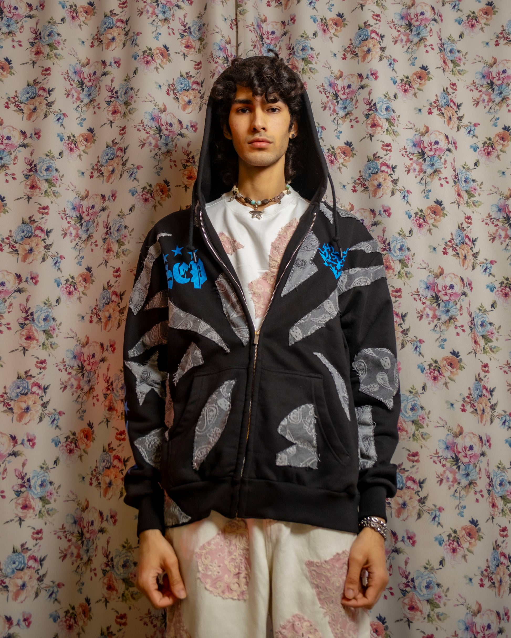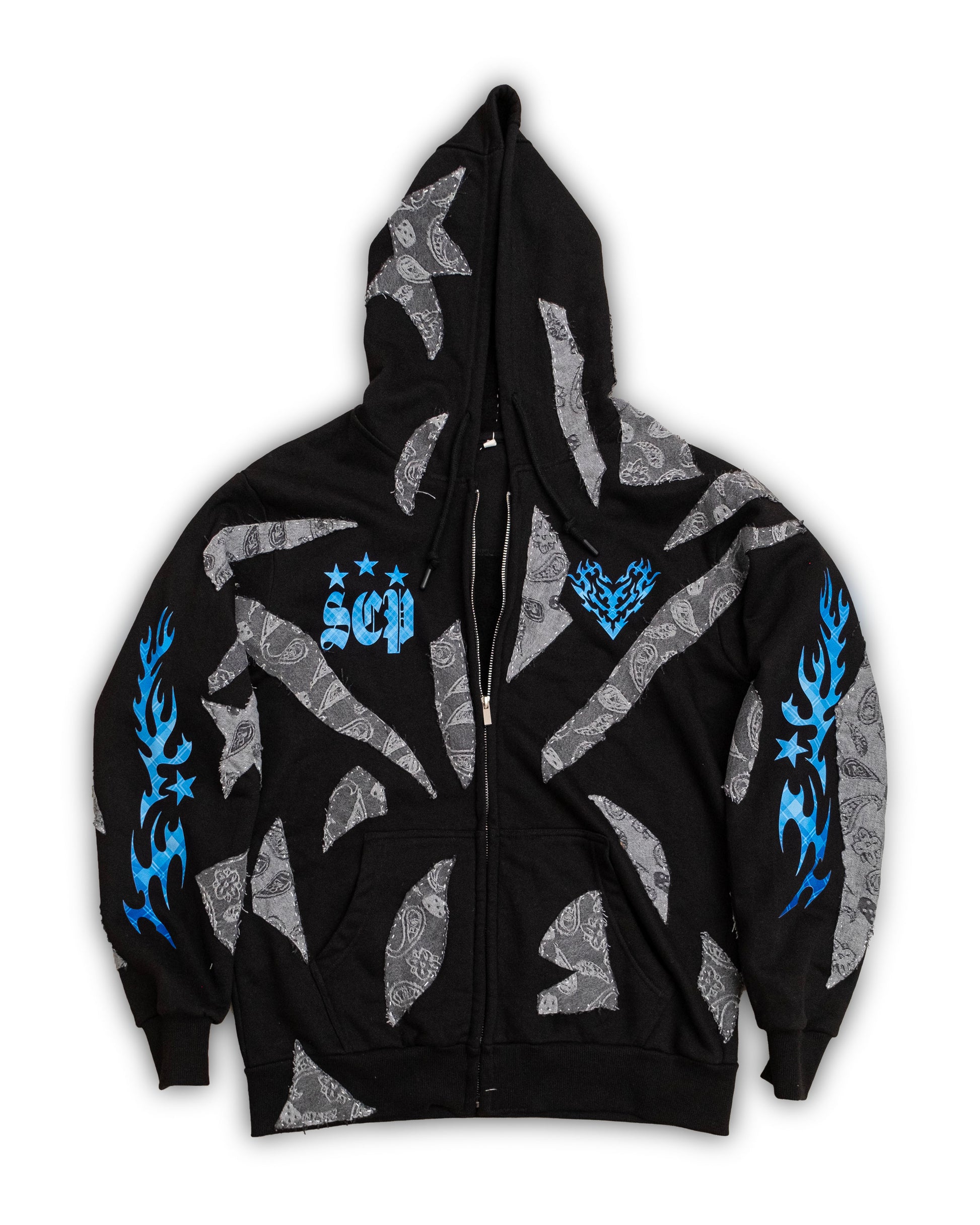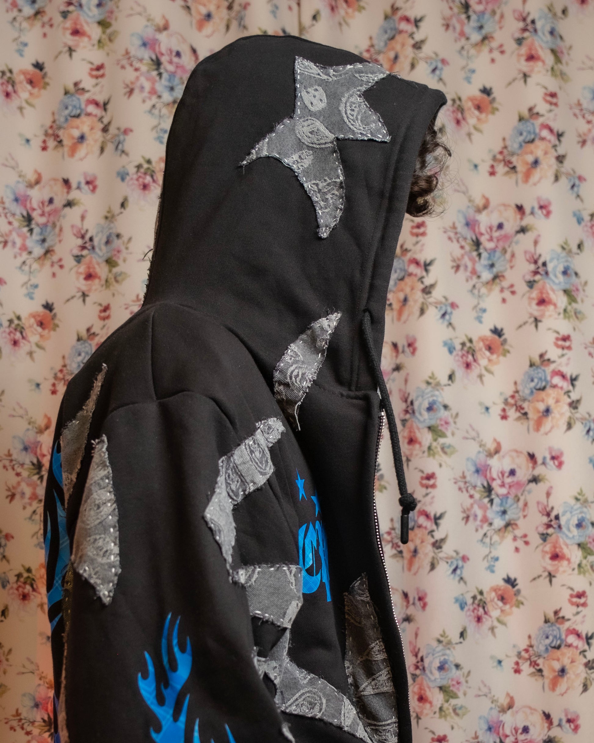 Beautiful 1 of a kind black zip hoodie with beautiful grey denim patchwork giving a nostalgic goth vibe and emphasizing the blue flames print! Only one of these hoodies will ever be made in this lifetime. It is a piece only for you. Comes in Size Large only.