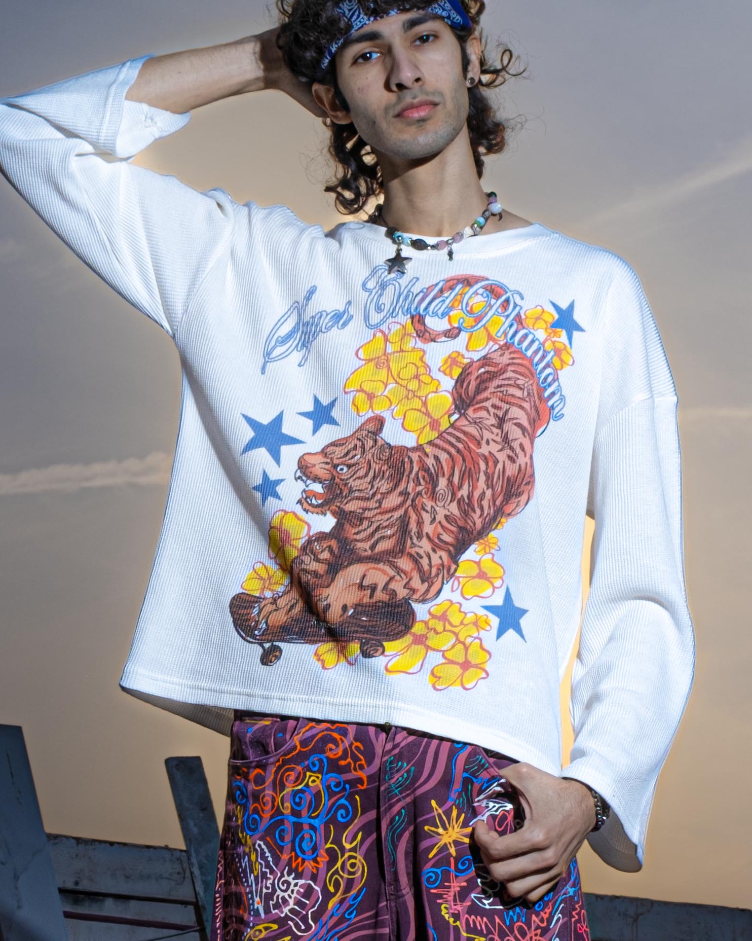With its textured waffle fabric and relaxed silhouette, this piece blends everyday wearability with statement art—perfect for layering or wearing solo.